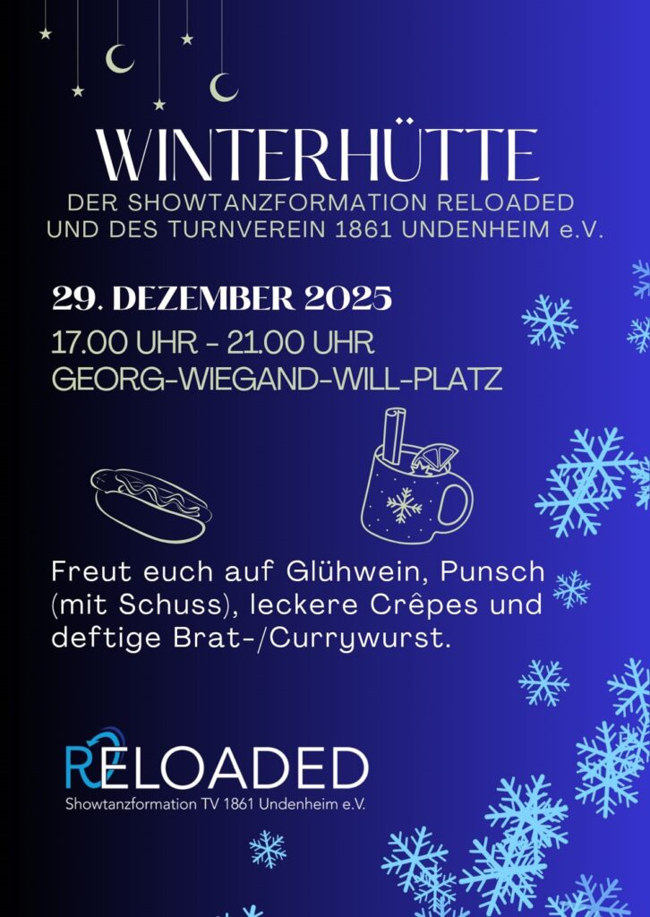 Die Showtanzformation „Reloaded“ und der TVU betreiben am 29. Dezember 2025 die Winterhütte am Georg-Wiegand-Will-Platz und laden hierzu ganz herzlich ein! Los geht’s um 17 Uhr, Ende ist gegen 21 Uhr.