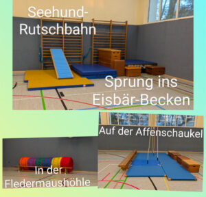 Bewegungsspiele als auch kleine Vorübungen für das allgemeine Turnen werden mit den Kinder geübt und ausprobiert. Zum geregelten Sporttreiben sollten die Kinder Sporthose, T-Shirt (In den Wintermonaten vielleicht auch was „Langes“) und Turnschlappen mitbringen.